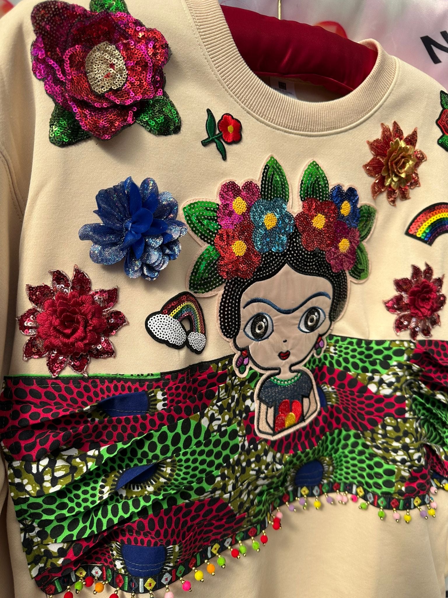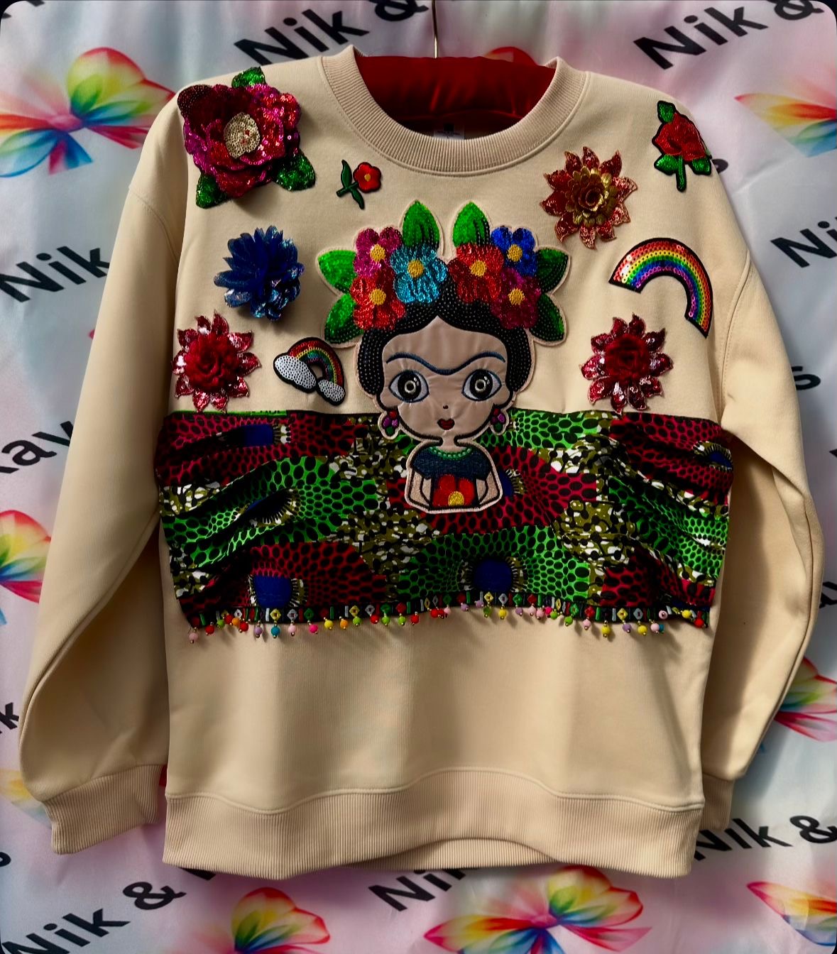 This vibrant sweatshirt features a playful, colorful graphic of a girl with floral rainbow accents, making it a bold addition to any casual wardrobe.