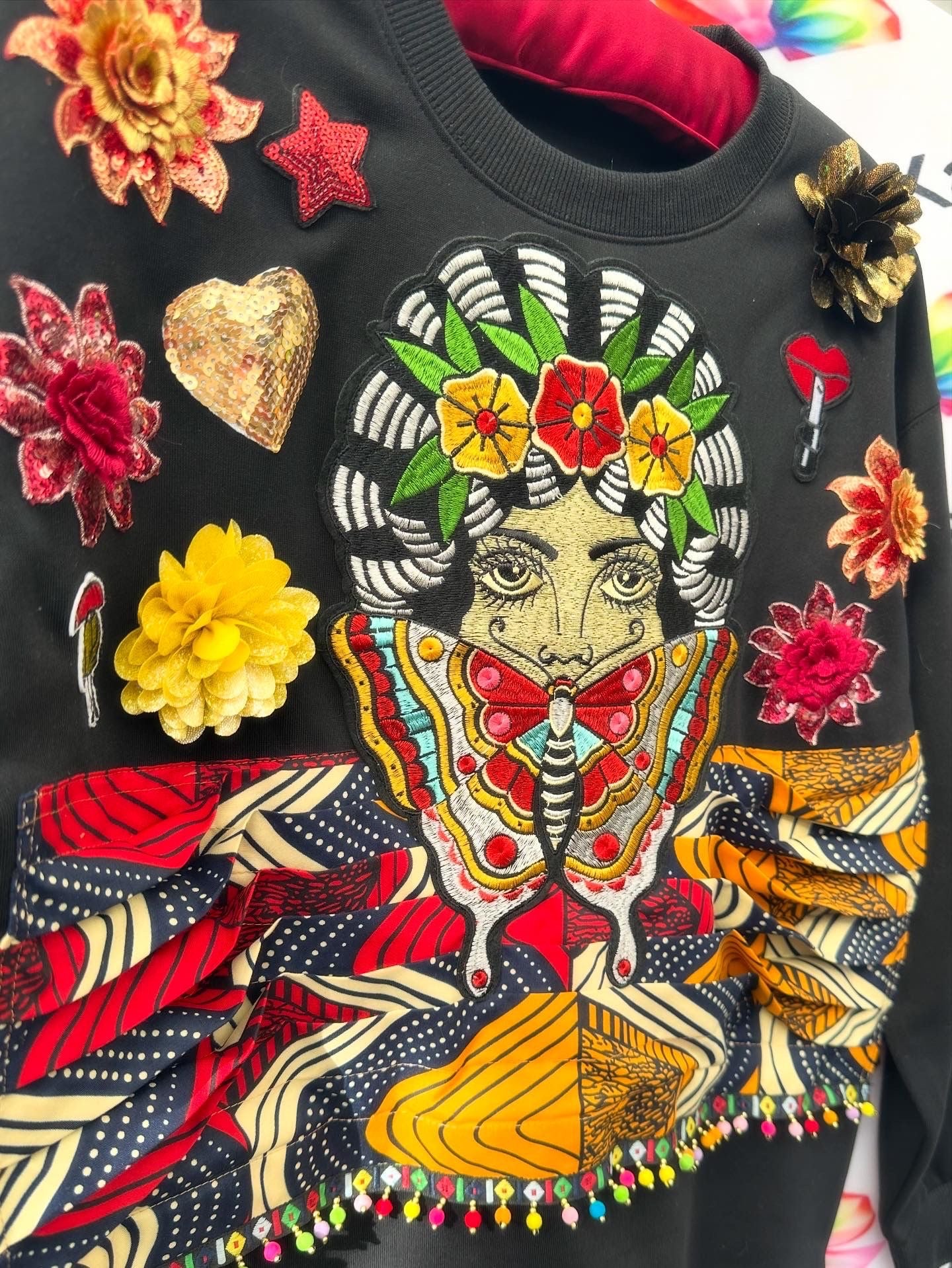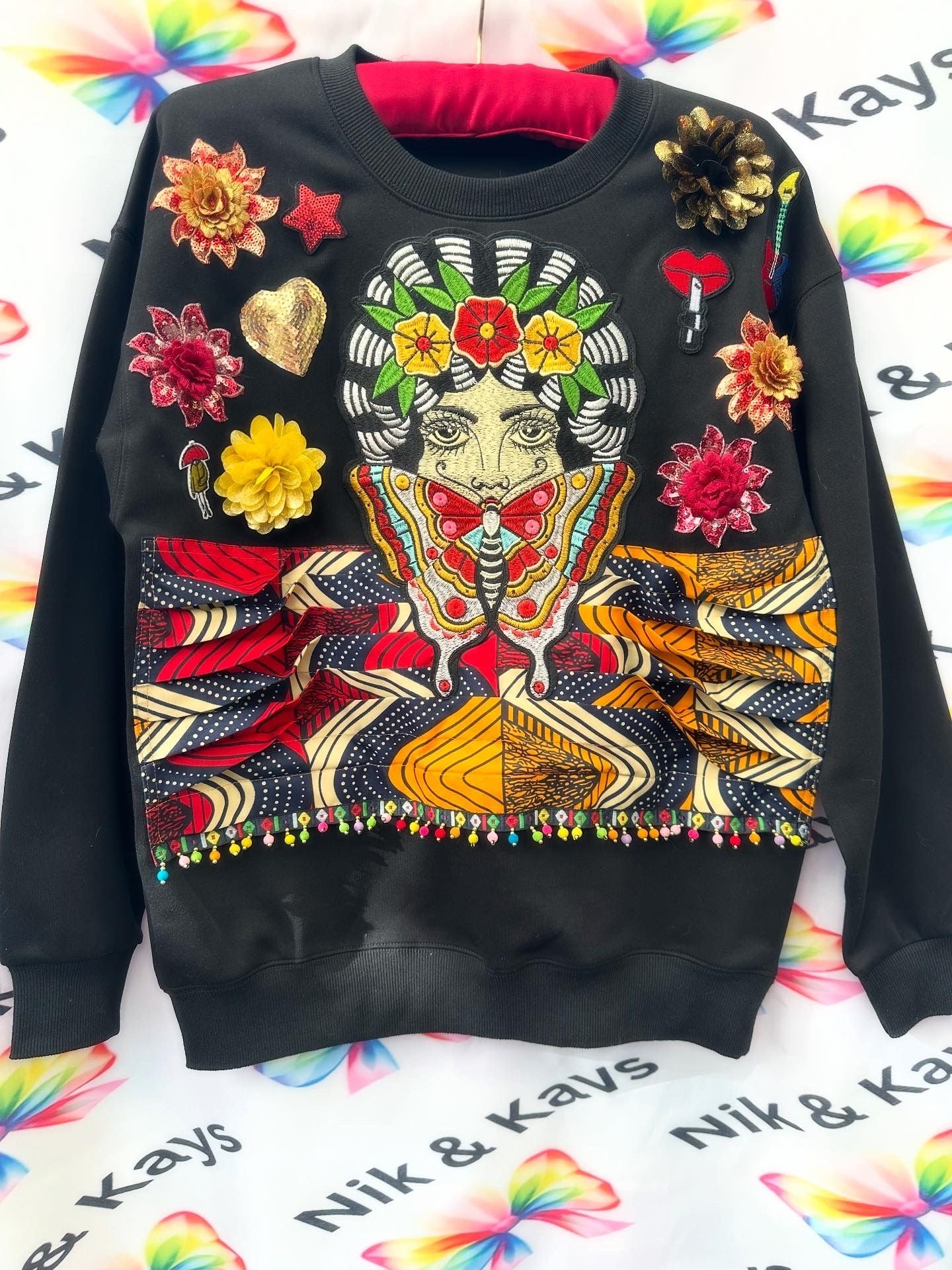 This Jumper features a bold artistic design. With colourful embroidered patches it’s perfect for those who love vibrant fashion statements.