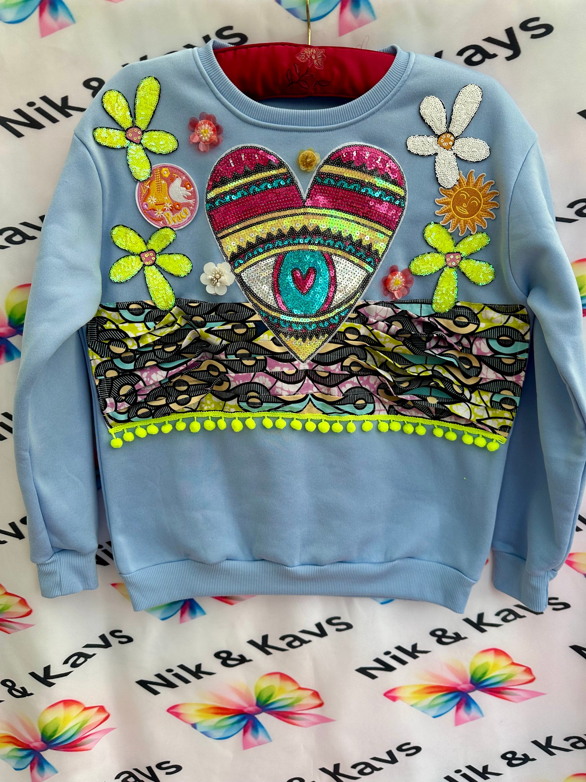 A vibrant and playful light blue sweatshirt featuring eye-catching embroidered and patchwork details. The perfect piece to add fun, artistic touch to casual outfits.